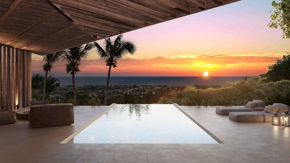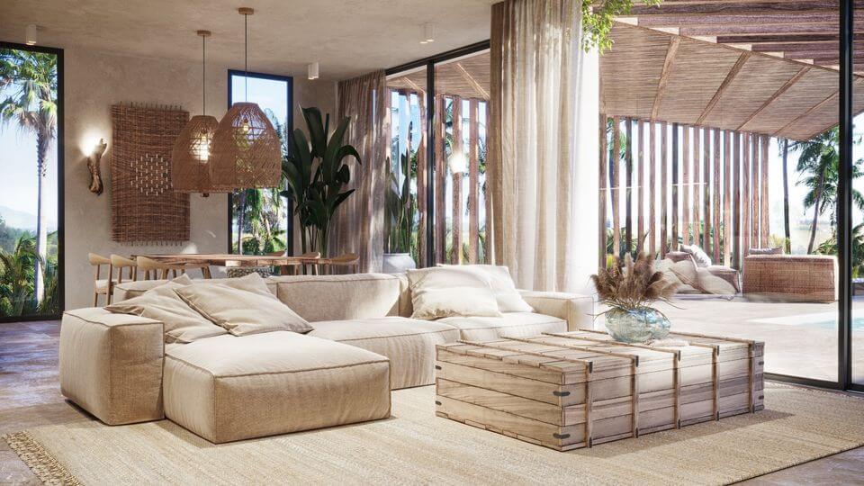 Accommodation of 65m², with separate double bedroom, spacious living room with integrated open plan kitchen, bathroom and with large garden and views to the pool.